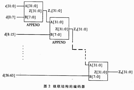 利用上述算法構(gòu)造APPEND模塊,其端口A和B分別表示前導(dǎo)序列的CRC和延拓的8比特序列,則其輸出端口Z為拓展之后序列的CRC。圖2利用APPEND模塊構(gòu)造了級(jí)聯(lián)結(jié)構(gòu)的64比特并行CRC編碼器。這種級(jí)聯(lián)構(gòu)造的編碼器設(shè)計(jì)比較簡(jiǎn)單。其中間節(jié)點(diǎn):