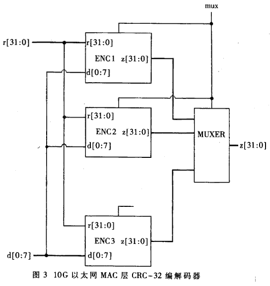 10G以太網(wǎng)接入系統(tǒng)中需要采用并行CRC編碼器。本文提出了基于組合邏輯的直接實(shí)現(xiàn)和基于流水線的實(shí)現(xiàn)方法。其中直接實(shí)現(xiàn)的方法又分為矩陣法和代入法兩種。經(jīng)過具體推導(dǎo)發(fā)現(xiàn)直接實(shí)現(xiàn)的編碼器可以滿足延時(shí)要求,因而被本系統(tǒng)所采用。而基于流水線的設(shè)計(jì)因?yàn)槠溲訒r(shí)較小,可以用于更高速的場(chǎng)合。本文提出的三種并行化設(shè)計(jì)方法已經(jīng)通過了硬件驗(yàn)證。這些設(shè)計(jì)思想同樣適用于其他線性移位寄存器,如擾碼器的設(shè)計(jì)。