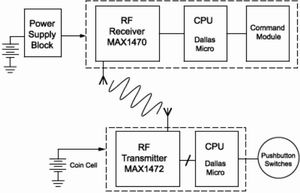 簡(jiǎn)單地說(shuō),RKE系統(tǒng)是由在鑰匙包(或鑰匙)中集成了RF發(fā)射器,發(fā)射器發(fā)送數(shù)據(jù)短脈沖到汽車(chē)中的接收器,接收器譯碼并通過(guò)接收器控制的制動(dòng)器使車(chē)門(mén)開(kāi)/關(guān)。無(wú)線鏈路載波頻率,在美國(guó)和日本用315MHz,歐洲用433.92MHz(ISM頻段)。在日本,是頻移鍵控(FSK),但是世界上大多數(shù)國(guó)家采用幅移鍵控(ASK)。載波在兩個(gè)電平幅度之間調(diào)制。為了節(jié)省功率,低電平通常接近零,這構(gòu)成了完全的開(kāi)關(guān)鍵控(OOK)。