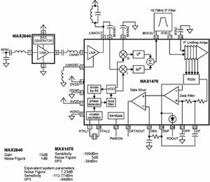 低發(fā)射功率受FCC規(guī)范、電池容量和發(fā)射天線定位(要求在RKE接收器芯片中有最大的靈敏度)的不確定性所限制。增強(qiáng)接收器靈敏度的一種方法是增加一個(gè)外部低噪聲放大器(圖3),但是,動(dòng)態(tài)范圍的限制,使這種方法在應(yīng)用中是不能接受的。下面是基于MAX1470超外差接收器的分析。