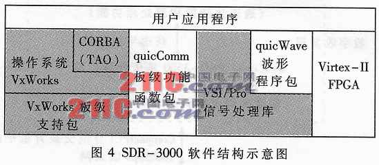 圖4為SDR-3000的軟件結(jié)構(gòu)示意圖。其中VSI/Pro是MPI軟件公司提供的矢量信號圖像處理標準庫。該車兼容VSIPL嵌入式API標準,包括各種通用處理函牧,如FIY、FIR濾波器。quicWave是基于VSI/Pro開發(fā)的車,用于開發(fā)波形組件。quicComm庫用于支持板級功能函數(shù),如處理器間的通信、可編程的FPGA和PowerPC的啟動及某些I/O操作等。