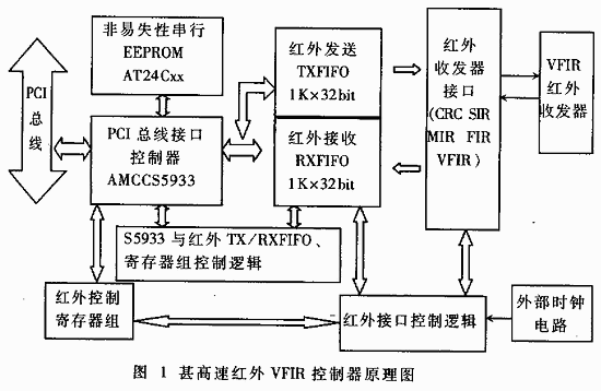 目前微機之間的紅外通信是基于IRDA-1.1標準的紅外無線串行SIR通信,參考文獻[2]給出了基于ISA總線的紅外無線串行通信卡的設(shè)計及實現(xiàn),該通信卡的數(shù)據(jù)速率為9.6kbps~115.2kbps,工作距離0~3m。但由于RS-232端口的最高數(shù)據(jù)速率上限為115.2kbps,不能滿足IRDA-1.4規(guī)范甚高速紅外VFIR 16Mbps速率要求,所以使用了PCI同步總線擴展外設(shè)的方法設(shè)計甚高速紅外控制器。雖然ISA總線的傳輸速率能滿足甚高速紅外控制器設(shè)計要求,但目前許多微機系統(tǒng)已經(jīng)逐漸淘汰ISA/EISA標準總線。原因是高速微處理器和低速ISA總線之間不同步,造成擴展外設(shè)只能通過一個慢速且狹窄的瓶頸發(fā)送和接收數(shù)據(jù),使CPU高性能受到嚴重影響。