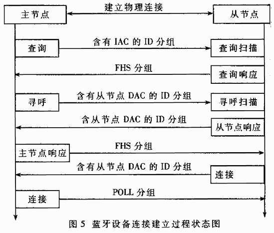 首先,主節(jié)點使用GIAC和DIAC來查詢范圍內(nèi)的藍(lán)牙設(shè)備(查詢狀態(tài))。如果任何附近的藍(lán)牙設(shè)備正在監(jiān)聽這些查詢(查詢掃描狀態(tài)),就發(fā)送它的地址和時鐘信息后,從節(jié)點可以開始監(jiān)聽來自主節(jié)點的尋呼消息(尋呼掃描),主節(jié)點在發(fā)現(xiàn)附近的設(shè)備之間可以尋呼這些設(shè)備(尋呼狀態(tài)),建立鏈接。在尋呼掃描的從設(shè)備被這個主節(jié)點尋呼后,就會以DAC(設(shè)備訪問碼)來響應(yīng)(Slave response substate)。主節(jié)點在接收到從節(jié)點的響應(yīng)后,便可以以送主節(jié)點的實時時鐘、BD_ADDR、BCH奇偶位和設(shè)備類(FHS分組包),最后在從節(jié)點已經(jīng)接收到這個FHS分組之后,進(jìn)入連接狀態(tài)。具體過程如圖5。