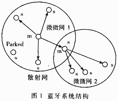 藍(lán)牙系統(tǒng)采用分散式(Scatter)結(jié)構(gòu),設(shè)備間以及從方式構(gòu)成微微網(wǎng)(Piconet),支持點對點和點對多點通信。它采用GFSK調(diào)制,抗干擾性能好,通過快速跳頻和短包技術(shù)來減少同頻干擾,保證傳輸?shù)目煽啃?。使用的頻段為無需申請許可的2.4GHz的ISM頻段。