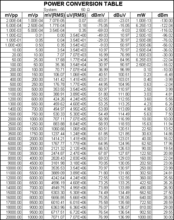 線電單位換算表-dBmV、mW、dBuV、dBm、mVpp、mVp、mV(RMS)、uV(RMS)相互轉(zhuǎn)換 System:50W&