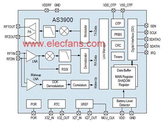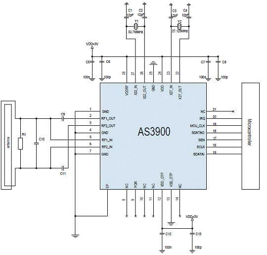 AS3900采用內置星型網絡管理協(xié)議,是全球唯一使用27 MHz ISM(工業(yè)、科學和醫(yī)療)頻段的收發(fā)器。使用該頻段避免了常用2.4 GHz頻段經常出現(xiàn)的干擾,同時減少人體對能量的吸收(SAR