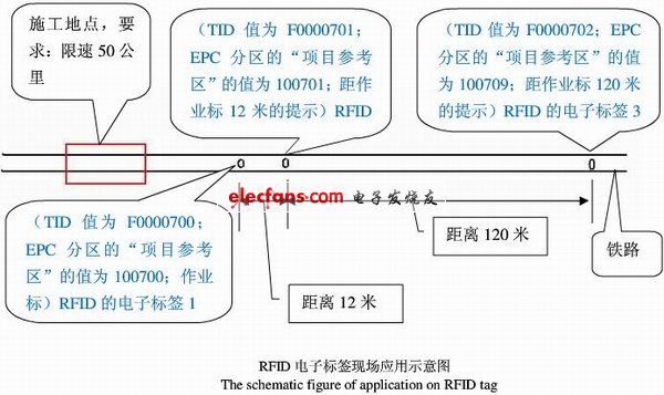 ??? 對(duì)封裝及設(shè)置好的RFID 電子標(biāo)簽安裝在所需安裝行車標(biāo)志地點(diǎn)的線路軌枕之間(這點(diǎn)與現(xiàn)有行車標(biāo)志牌的安裝有區(qū)別,現(xiàn)有行車標(biāo)志牌安裝在醒目位置的線路兩旁),所示;對(duì)設(shè)置好的RFID 電子標(biāo)簽“成組”使用,使連續(xù)警示和分區(qū)段提醒成為可能,是現(xiàn)有行車標(biāo)志所無法比擬的。