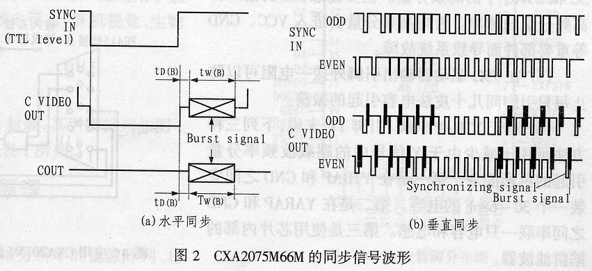 CXA2075M所需的行、場同步脈沖信號是通過10腳的SYNCIN輸入端引入復(fù)合同步信號分離產(chǎn)生的,其波形如圖2所示。