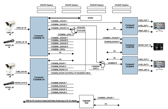 The CX25838-2x (without DDR2 interface) may be cascaded with the CX25838- 1x to allow frame-interleaved output of up to 16 video channels. High-speed headers on the board are designed to allow uncompressed video and audio output from the CX25838 devices to easily cable over to H.264 development platforms. The CX25838 contains enhancements specific to surveillance applications, such as programmable motion detection, expanded line-locked camera frequency ranges, and enhanced low-level input locking capabilities.