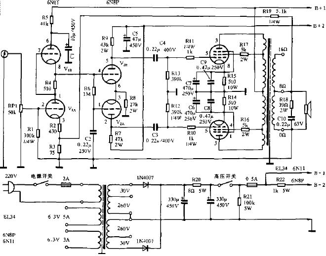 ??? 電源由電源變壓器屏極高壓、柵負(fù)偏壓、燈絲電壓組成。該機(jī)電源變壓器采用250W、C型鐵芯。初級(jí)0-240V-220V兩組;次級(jí)260V+30V兩組,經(jīng)1N4007電源整流二極管全波整流后,可提供B+直流高壓380V,EL34燈絲電壓6.3V、5A兩組,6N11、6N8燈絲電壓6.3V 3A一組。