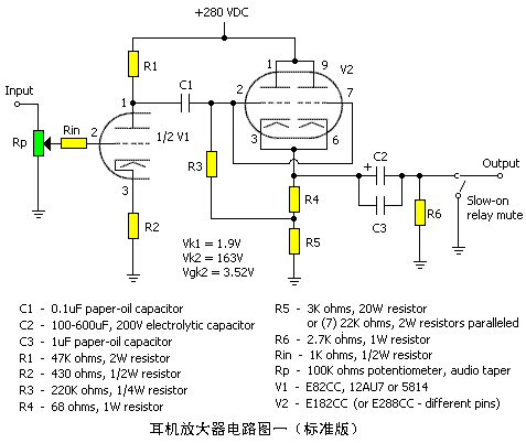 1391雙三極管ECC822電子管組成的OTL耳機(jī)放大器電路