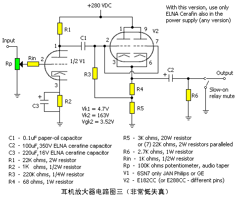 在以上三個版本中,輸出電子管V2的偏流都是每只26mA(加起來52mA),總功耗6W(2x3W)。僅指使用Mullard或JAN Philips的電子管而言。
