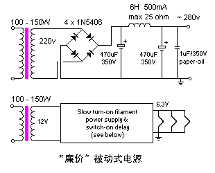 9/17/98:改進(jìn)圖4穩(wěn)壓電源:用MOSFET/BJT達(dá)林頓管代替單只MOSFET,更好地控制大容量電解的涌動電流。改進(jìn)圖4和圖5:燈絲接地,斷開圖3的“E”點(diǎn)。增加電源的“廉價”版本(圖6)。