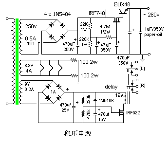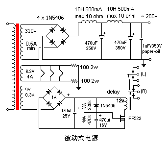 就電源而言,燈絲用交、直流供電均可,但是版本二中的3A5除外,它必須用直流供電。每種電源都帶有延時繼電器,它在電子管進(jìn)入穩(wěn)定工作狀態(tài)之前使輸出靜音。我設(shè)計(jì)了三種電源-穩(wěn)壓電源、被動式電源和廉價被動式電源: