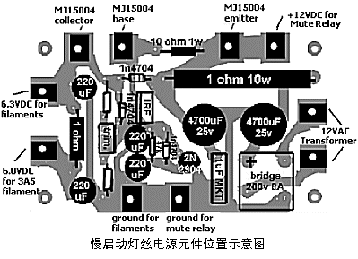 本機(jī)燈絲不用直流供電時也沒有什么噪聲。不過,為了使燈絲電壓更加穩(wěn)定,我建議用圖7的慢啟動電路來代替圖4和圖5的線路。并且,版本二的3A5要求使用直流燈絲供電,此電路也最為適合。慢啟動電源可以延長電子管的壽命!MJ15004需要加裝散熱器,它的功耗是12W。