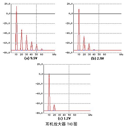 圖9顯示出THD(失真)在9.5V、2.9V和1.2V情況下的衰減情況。太完美了!它們顯現(xiàn)出線形的諧波衰減(功率越小失真就越低)。