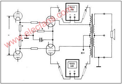 ?? 具體的校準(zhǔn)方法是,采用直流電流表500mA檔,分別串接在功放管的屏極回路內(nèi),功放管柵極有音頻信號(hào)輸入時(shí),如果屏極電流升高,則表示該功放管的柵極負(fù)壓過(guò)低;反之,如在有音頻信號(hào)輸入時(shí),功放管的屏極電流隨之降低,則表明柵極負(fù)壓過(guò)高。因此,A類(lèi)功放的屏流變化必須保持在10%左右,如果屏流變化較大時(shí),則表明工作狀態(tài)不穩(wěn)定,或已經(jīng)進(jìn)入AB類(lèi)的工作狀態(tài)之中。