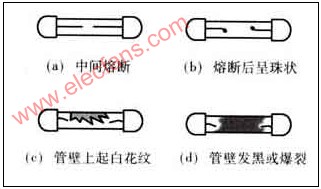 ?? 如圖10(a)保險(xiǎn)絲中間熔斷。裝上符合規(guī)格的保險(xiǎn)絲,如再次熔斷,則表明機(jī)內(nèi)有局部短路現(xiàn)象或過(guò)電流現(xiàn)象。