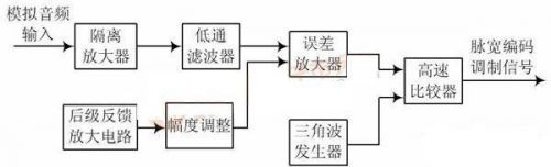 輸入的模擬音頻信號(hào)首先經(jīng)隔離放大器進(jìn)行放大,再與反饋回來的音頻信號(hào)一起送到誤差放大器,輸出放大的誤差音頻信號(hào)。將放大的誤差信號(hào)和載波信號(hào)送到脈寬調(diào)制器,進(jìn)行NBDD 調(diào)制。載波信號(hào)是由三角波發(fā)生器產(chǎn)生的高線性度的模擬三角波信號(hào),頻率為230~ 280 kHz。