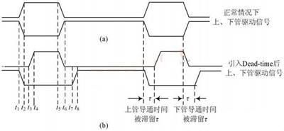 通過串通損耗產(chǎn)生的原理,可以在柵極驅(qū)動(dòng)電壓上想辦法,在上管完全截止后再讓下管開始導(dǎo)通,在下管完全截止后再讓上管開始導(dǎo)通,這樣就可以減小串通損耗,同時(shí)又可以減小結(jié)電容Cds 損耗。這種為了解決串通損耗而在兩驅(qū)動(dòng)信號(hào)之間按 延遲導(dǎo)通,正常截止 的原則,加入的時(shí)間稱為Dead T ime( 死區(qū)時(shí)間) ,原理詳見圖3。圖中分析的是工作在一個(gè)開關(guān)臂上的兩個(gè)N 溝場效應(yīng)管。