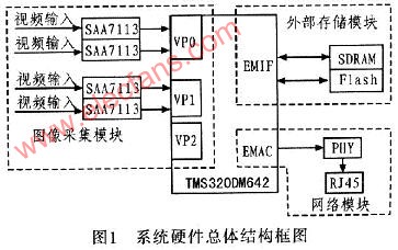 0 本文以TMS320C6000系列DSP中的一款TMS320DM642多媒體芯片為例,來具體說明如何設(shè)計嵌入式DSP數(shù)字視頻監(jiān)控系統(tǒng)的硬件電路。
