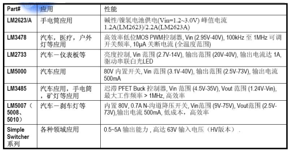表2:美國國家半導體的LED驅動器解決方案一覽表。