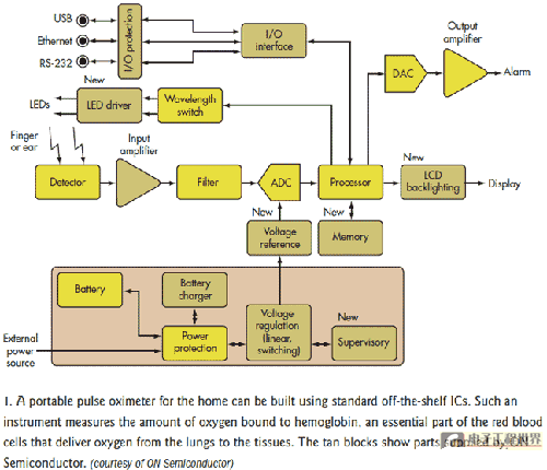 典型的便攜式醫(yī)療電子系統(tǒng),內(nèi)含的部件包括用來擷取數(shù)據(jù)的模擬前端部件、用來調(diào)節(jié)信號的放大器與濾波器、模擬對數(shù)字轉(zhuǎn)換器、收集使用者回饋的按鈕、用來演算的微控制器以及用來連結(jié)液晶屏幕與USB連結(jié)端口的各種