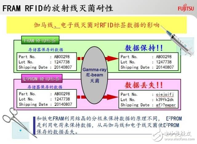 3755 的人經(jīng)常會看到,配置有電子標簽的注射器具。手術器具要用伽瑪射線進行消毒,能夠抵抗照射劑量高達50kGy伽瑪射線消毒的只有內(nèi)置FRAM(非易失性隨機存儲器)的電子標簽。我們可以肯定高可靠性的FRAM是適用于高端醫(yī)療領域的為數(shù)不多的電子產(chǎn)品。
