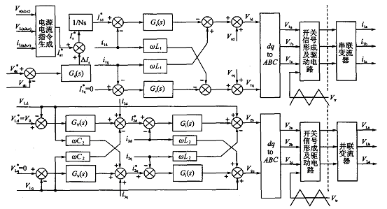 對于圖1所示的雙變流器串并聯(lián)補(bǔ)償式UPS應(yīng)使得市電輸入電流is是與電源基波電壓vsl同相的正弦有功電流,電源供電的功率因數(shù)為1;同時負(fù)載電壓vL為基波正弦電壓,且vL=vR(額定值)并與vsl同相。為實現(xiàn)此控制目標(biāo),采用圖2所示的基于同步旋轉(zhuǎn)坐標(biāo)系下的控制系統(tǒng)。