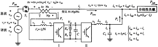 Δvh為諧波補(bǔ)償電壓,它與交流電源中的諧波電壓vsh大小相等,但方向相反;Δvl為基波電壓補(bǔ)償量,補(bǔ)償電源電壓基波Δvsl與負(fù)載電壓額定值vR的偏差。所以變流器I提供的補(bǔ)償電壓Δv既抵消vs中的諧波vsh,又補(bǔ)償基波電壓vsl,使負(fù)載電壓vL成為與電源基波電壓vsl同相的正弦波額定電壓vR。
