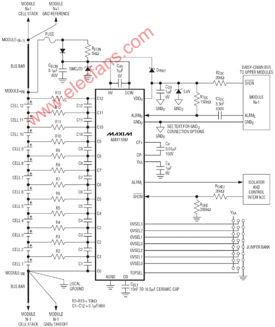 圖,采用MAX11080實(shí)現(xiàn)的12節(jié)電池系統(tǒng)典型應(yīng)用電路