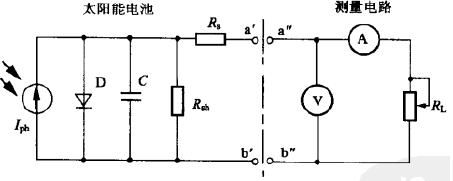 聯(lián)電阻、半導(dǎo)體結(jié)等的具體參數(shù)。測(cè)試的基本電路如圖.左邊是待測(cè)光伏電池的等效電路,右邊是測(cè)量電路。測(cè)試最好借助于可調(diào)光源,如太陽(yáng)模擬器來(lái)做。