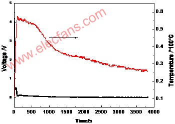 ? 過(guò)放電時(shí)間、電池電壓、表面溫度三者之間的關(guān)系圖如圖9和圖10所示。