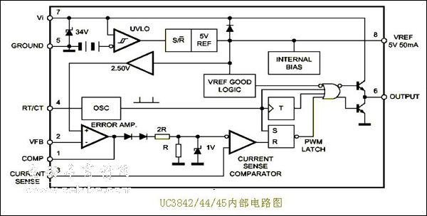 UC3842為雙列8腳單端輸出的它激式開關電源驅動集成電路,其內部功能包括:基準電壓穩(wěn)壓器、誤差放大器、脈沖寬度比較器、鎖存器、振蕩器、脈寬調制器(PWM)、脈沖輸出驅動級等等。UC3842的同類產品較多,其中可互換的有 MC3842、IR3842N、SG3842、CM3842(國產)、LM3842等。UC3842內部方框圖見圖。其特點如下: