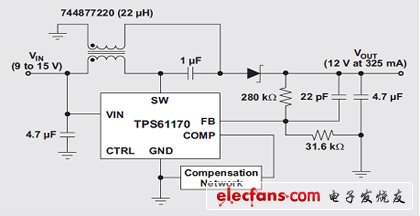 盡管DC/DC單端初級電感轉(zhuǎn)換器 (SEPIC) 拓?fù)洳皇鞘裁葱聳|西,但的確直到最近它才開始流行起來,然而,對于能夠?qū)Ω叩洼斎腚妷褐g的輸出電壓(例如:12V未校準(zhǔn)插墻式電源)進(jìn)行調(diào)節(jié)的轉(zhuǎn)換器需求一直都存在。雖然我們可以將任何升壓轉(zhuǎn)換器/控制器配置為一個 SEPIC,但其在最近才得到普遍的使用。兩個因素促進(jìn)了 SEPIC 的人氣大增:(1) IC 制造廠商已經(jīng)開始制造更多具有電流模式控制功能的升壓控制器,旨在簡化補償;(2) 電感制造廠商已經(jīng)開始制造許多可以最小化轉(zhuǎn)換器總 PCB 體積的單封裝耦合電感。改用耦合電感以后,許多具有兩個單獨電感應(yīng)用的電源體積可以縮減三分之一。圖 1 顯示了使用 TI TPS61170 和 Wuerth 744877220 的一個 SEPIC。