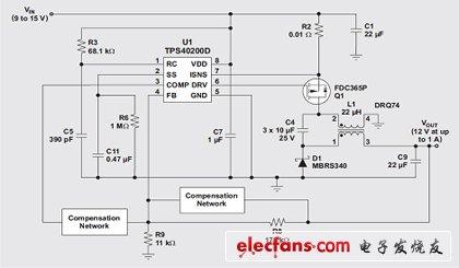 圖 2 使用 TI TPS40200 和 Coiltronics DRQ74 的 ZETA 轉(zhuǎn)換器