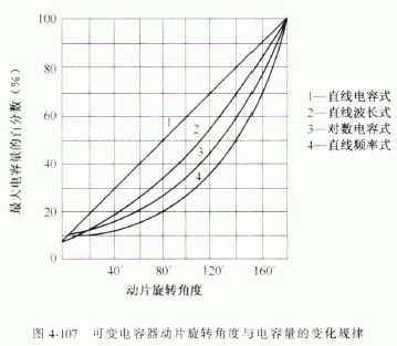 為了適應(yīng)不同應(yīng)用場(chǎng)合的要求,空氣可變電容器的動(dòng)片常作成不同的形狀,常見(jiàn)的有直線電容式、直線被長(zhǎng)式、直線頻率式及對(duì)數(shù)電容式等形式??勺冸娙莸膭?dòng)片形狀及其對(duì)應(yīng)的容量變化規(guī)律如圖4-107 所示。