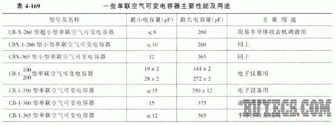 空氣介質(zhì)可變電容器又有單聯(lián)和雙聯(lián)之分,表4-169 和表4-170 分別列出了一些單聯(lián)空氣可變電容器和雙聯(lián)空氣可變電容器的主要性能及用途。