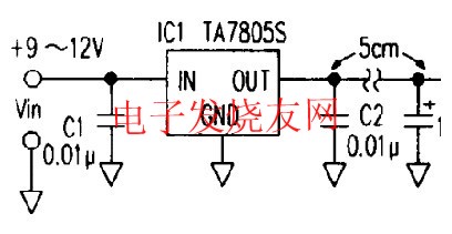 在應(yīng)用三端穩(wěn)壓器時,一般都在其輸入端和輸出端各接一支0.1μF的小電容器,以保證其穩(wěn)定工作。上圖是一個5V穩(wěn)壓電源,在組裝電路時,恰遇庫房0.1μF電容斷貨,于是用O.01μF電容代替,考慮到后續(xù)電路還并有多個旁路電容。以為并無大礙。在電路板上,C1、C2緊靠三端穩(wěn)壓器安裝。電解電容C3距三端穩(wěn)壓器5cm,而旁路電容C4~C7則靠近各自的IC。