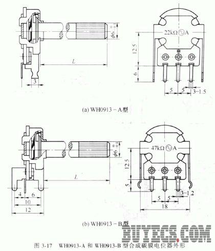 WH0913-A、WH0913-B 型合成碳膜電位器的外形如圖3-17 所示,其主要參數(shù)見(jiàn)表3-12 。