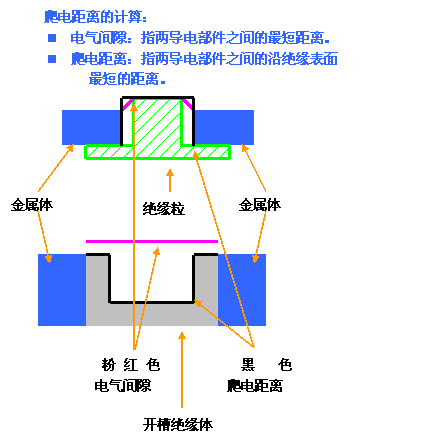 在兩個導(dǎo)電零部件之間或?qū)щ娏悴考c設(shè)備防護(hù)界面之間測得的最短空間距離。即在保證電氣性能穩(wěn)定和安全的情況下,通過空氣能實現(xiàn)絕緣的最短距離。