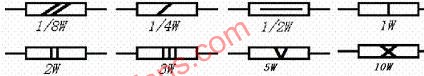 額定功率:在規(guī)定的環(huán)境溫度和濕度下,假定周圍空氣不流通,在長(zhǎng)期連續(xù)負(fù)載而不損壞或基本不改變性能的情況下,電阻器上允許消耗的最大功率。為保證安全使用,一般選其額定功率比它在電路中消耗的功率高1-2倍。額定功率分19個(gè)等級(jí),常用的有 0.05W、0.125W、0.25W、0.5W、1W、2W、3W、5W、7W、10W,在電路圖中非線繞電阻器額定功率的符號(hào)表示如下圖: