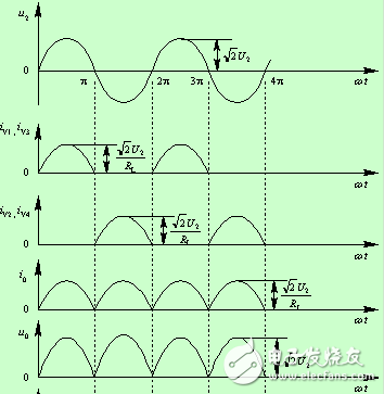 可見,在u2變化的一個周期內(nèi),負載RL上始終流過自上而下的電流,其電壓和電流的波形為一全波脈動直流電壓和電流,如下圖所示。