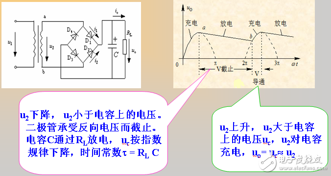 1)輸出電壓平均值的大小與濾波電容C及負載電阻RL的大小有關,C的容量或RL的阻值越大,其放電速度越慢,輸出電壓也越大,濾波效果越好。