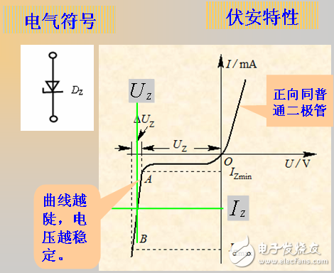 當穩(wěn)壓二極管工作在反向擊穿狀態(tài)下,當工作電流Iz在Izmax和 Izmin之間時,其兩端電壓近似為常數(shù)。
