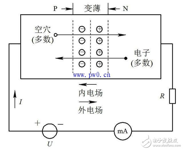 由于外加電源產(chǎn)生的外電場的方向與PN結(jié)產(chǎn)生的內(nèi)電場方向相反,削弱了內(nèi)電場,使PN結(jié)變薄,有利于兩區(qū)多數(shù)載流子向?qū)Ψ綌U(kuò)散,形成正向電流,此時(shí)PN結(jié)處于正向?qū)顟B(tài)