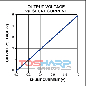 圖1. 以地為參考的輸出電壓VOUT?= ISHUNT?(4.80V/A),正比于高端負(fù)載電流。當(dāng)前配置下,電路可測量高達(dá)1A的負(fù)載電流。