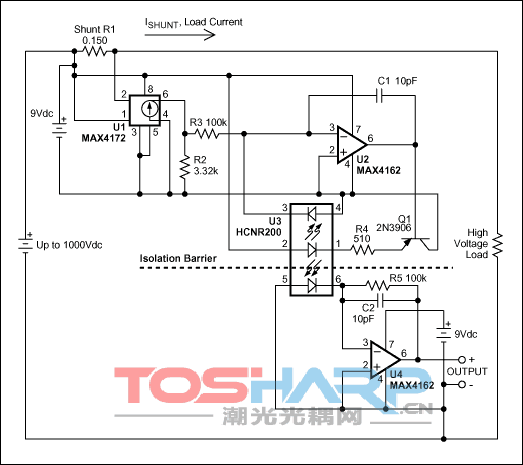 電路包含一個浮地單元和一個接地單元,每個單元都需要一個本地的低壓電源。浮地單元檢測負(fù)載電流,并驅(qū)動光耦的高壓側(cè)。接地單元監(jiān)測光耦的低壓側(cè),輸出一個正比于高端負(fù)載電流的電壓。所選用的光耦在高壓側(cè)有一個用于反饋的光敏二極管,從根本上消除了LED的非線性和溫漂。另外,兩個光敏二極管的嚴(yán)格匹配保證了信號在穿過隔離層時傳輸函數(shù)保持良好的線性。