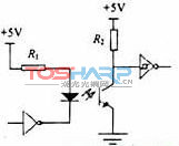 微機有多個輸入埠,接收來自遠處現場設備傳來的狀態(tài)信號,微機對這些信號處理后,輸出各種控制信號去執(zhí)行相應的操作。在現場環(huán)境較惡劣時,會存在較大的雜訊干擾,若這些干擾隨輸入信號一起進入微機系統(tǒng),會使控制準確性降低,產生誤動作。因而,可在微機的輸入和輸出端,用光耦作介面,對信號及雜訊進行隔離。典型的光電耦合電路如圖6所示。該電路主要應用在“A/D轉換器”的數位信號輸出,及由CPU發(fā)出的對前向通道的控制信號與類比電路的介面處,從而實現在不同系統(tǒng)間信號通路相聯(lián)的同時,在電氣通路上相互隔離,并在此基礎上實現將類比電路和數位電路相互隔離,起到抑制交叉串擾的作用。