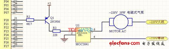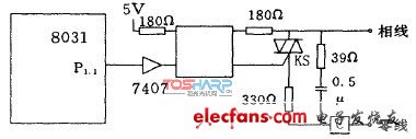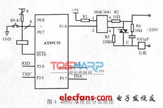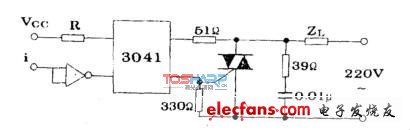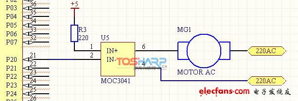 圖中的光耦MOC3041是用來隔離可控硅上的交流高壓和直流低壓控制信號的。其輸出用來觸發(fā)雙向可控硅,選用ST